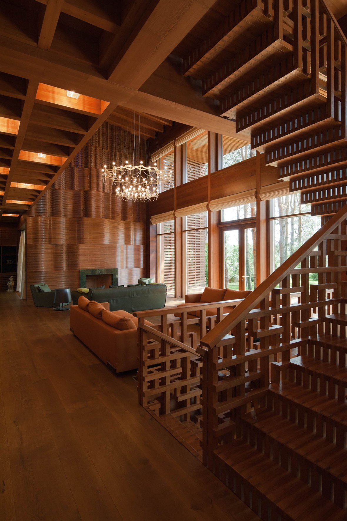 Большая гостиная с камином и лестницей
